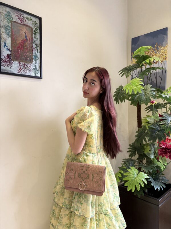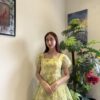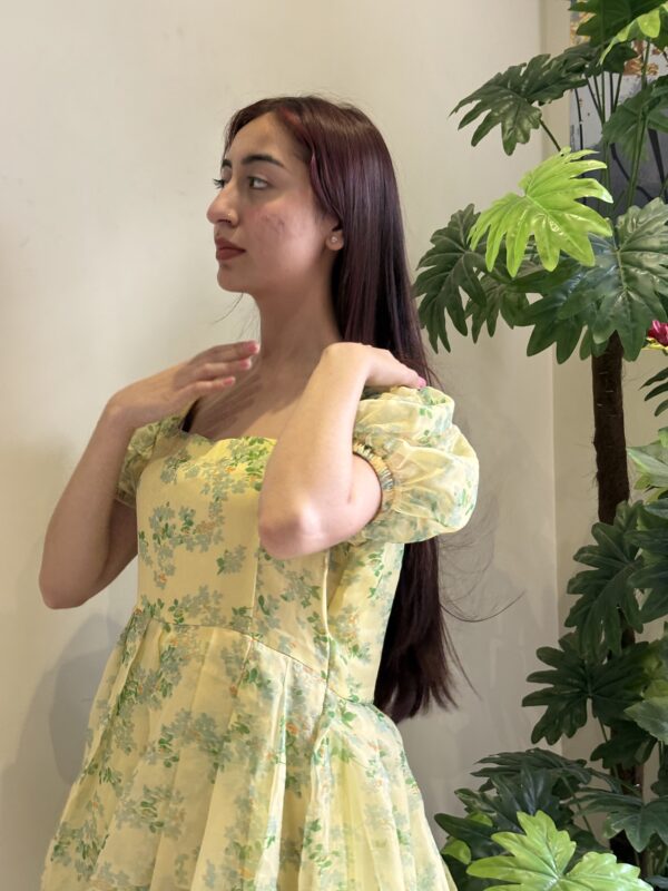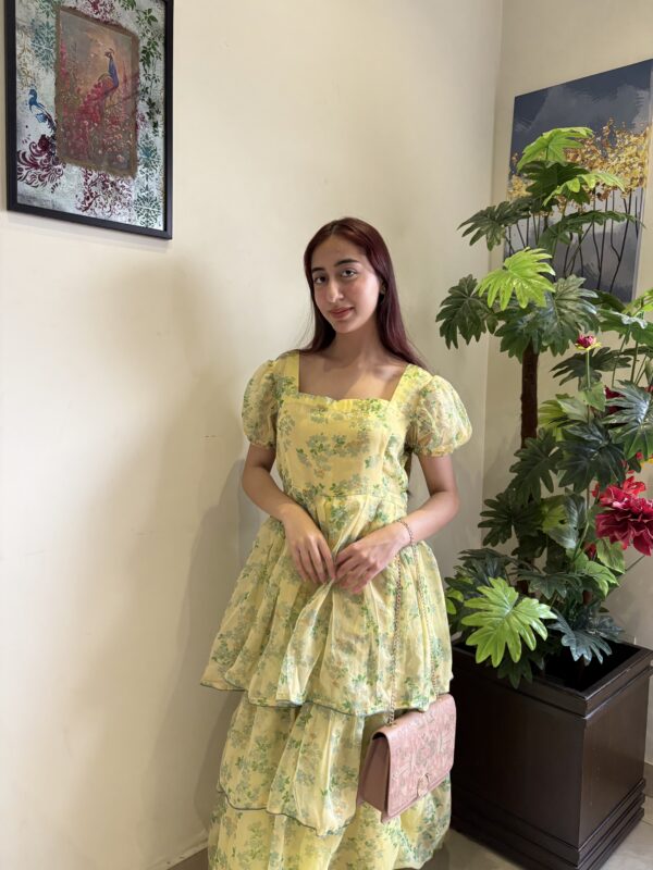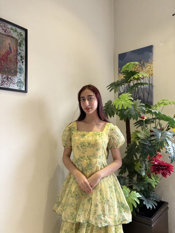 + ShippingA charming yellow floral frock featuring puffed sleeves, a tiered layered skirt, and a soft vinatge-inspired silhouette perfect for an elegant look.