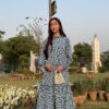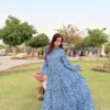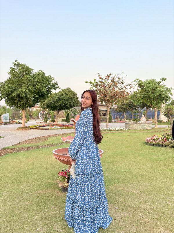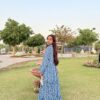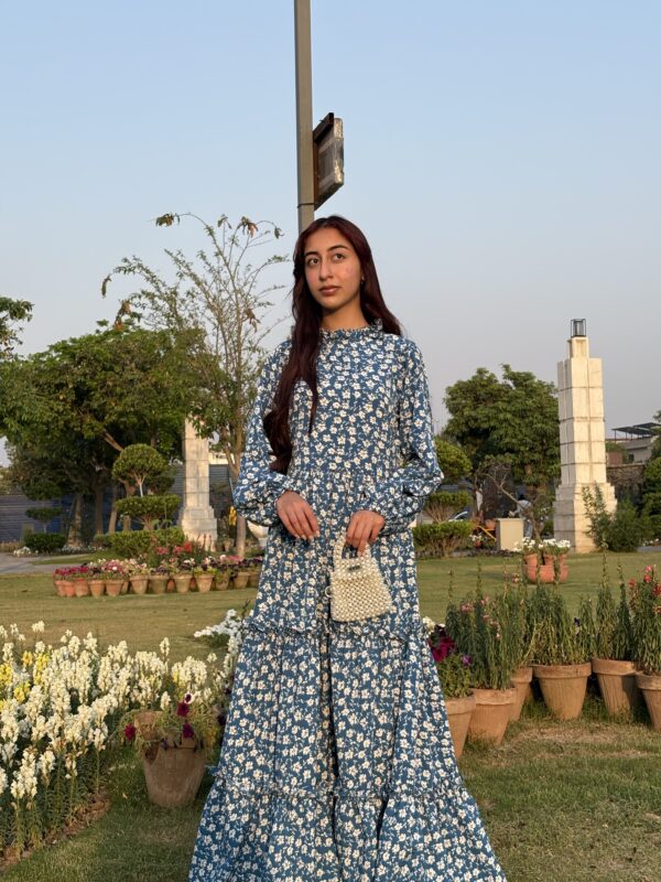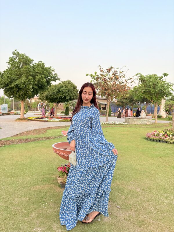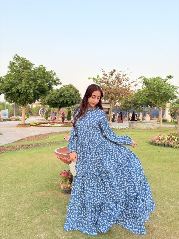 A breezy blue maxi dress sprinkled with tiny white florals, radiating effortless charm and a fresh countryside vibe.Fabric: Georgette.