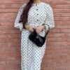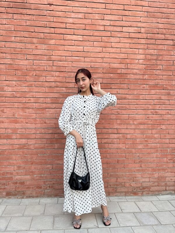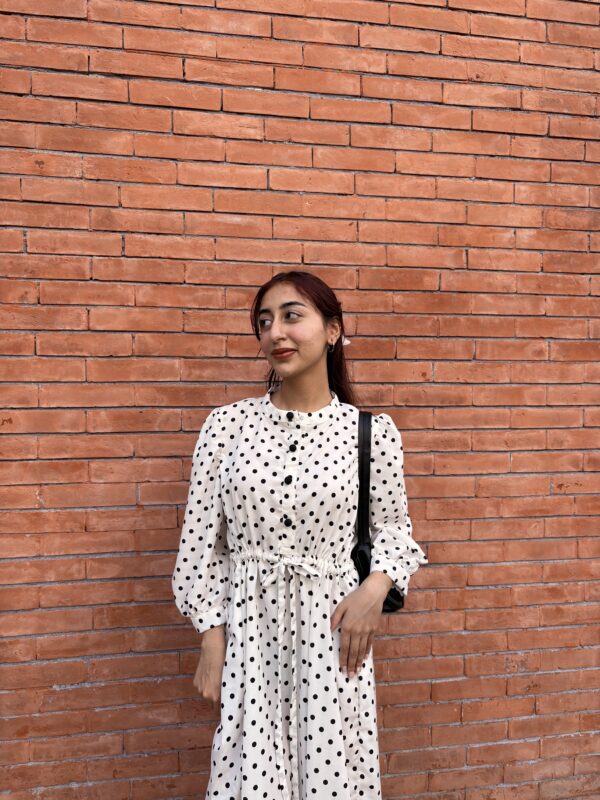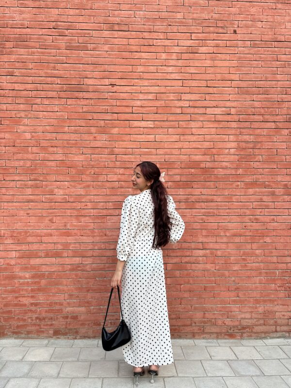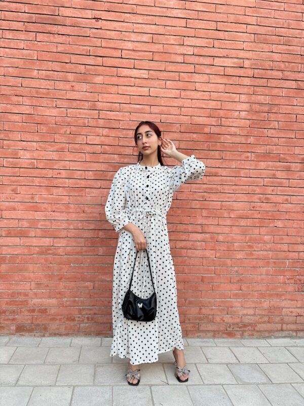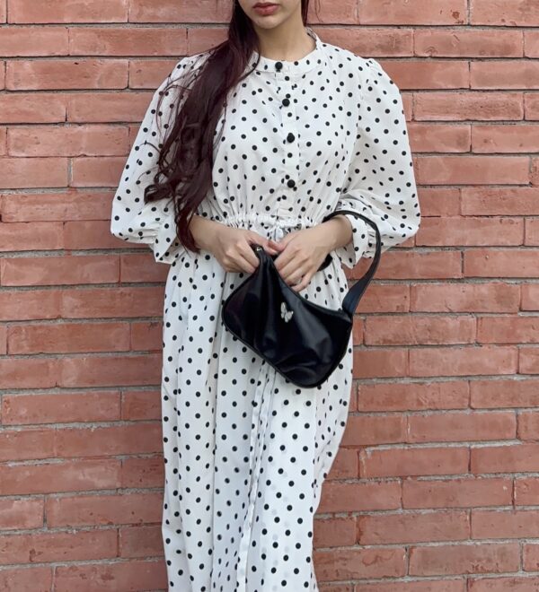 + ShippingA timeless white frock adorned with playful black polka dots, cinched at the waist for a flattering, vintage-inspired silhouette.