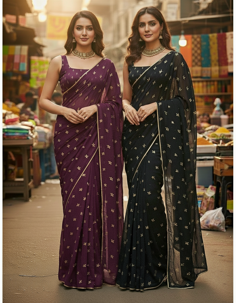 + ShippingWrap yourself in the timeless beauty of tradition with our Banarsi Chiffon Saree, available in all colors. Woven with intricate golden patterns on soft chiffon, this saree perfectly blends luxury with comfort. Lightweight and graceful, it drapes effortlessly making it the perfect choice for festive occasions, weddings, and formal gatherings.