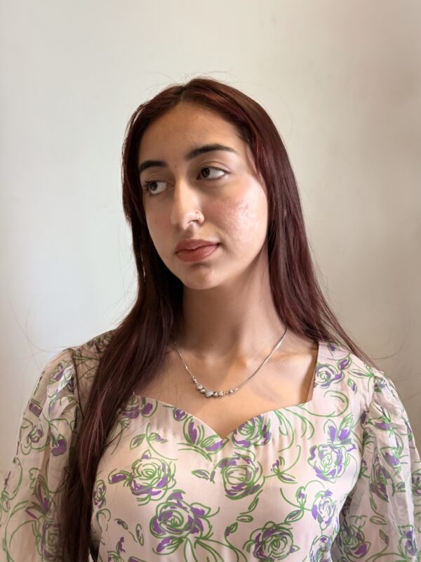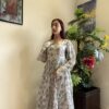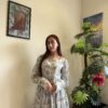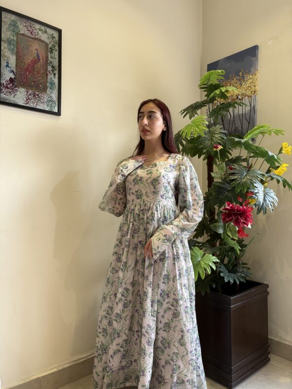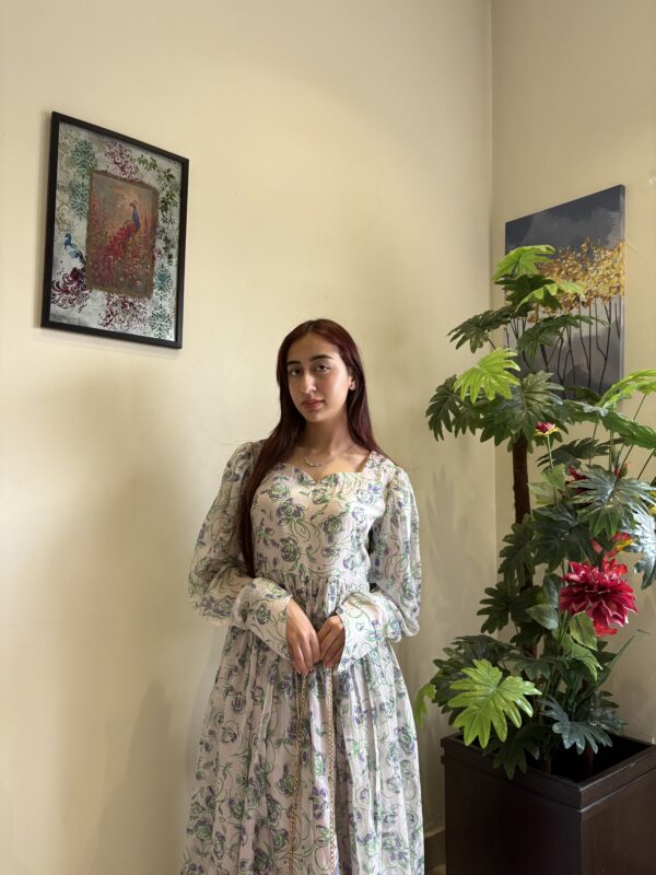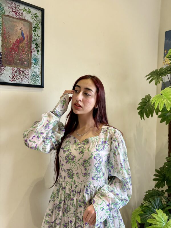 A graceful long-sleeves frock adorned with delicate purple rose motifs, creating a timeless, romantic silhouette with an old-world charm.