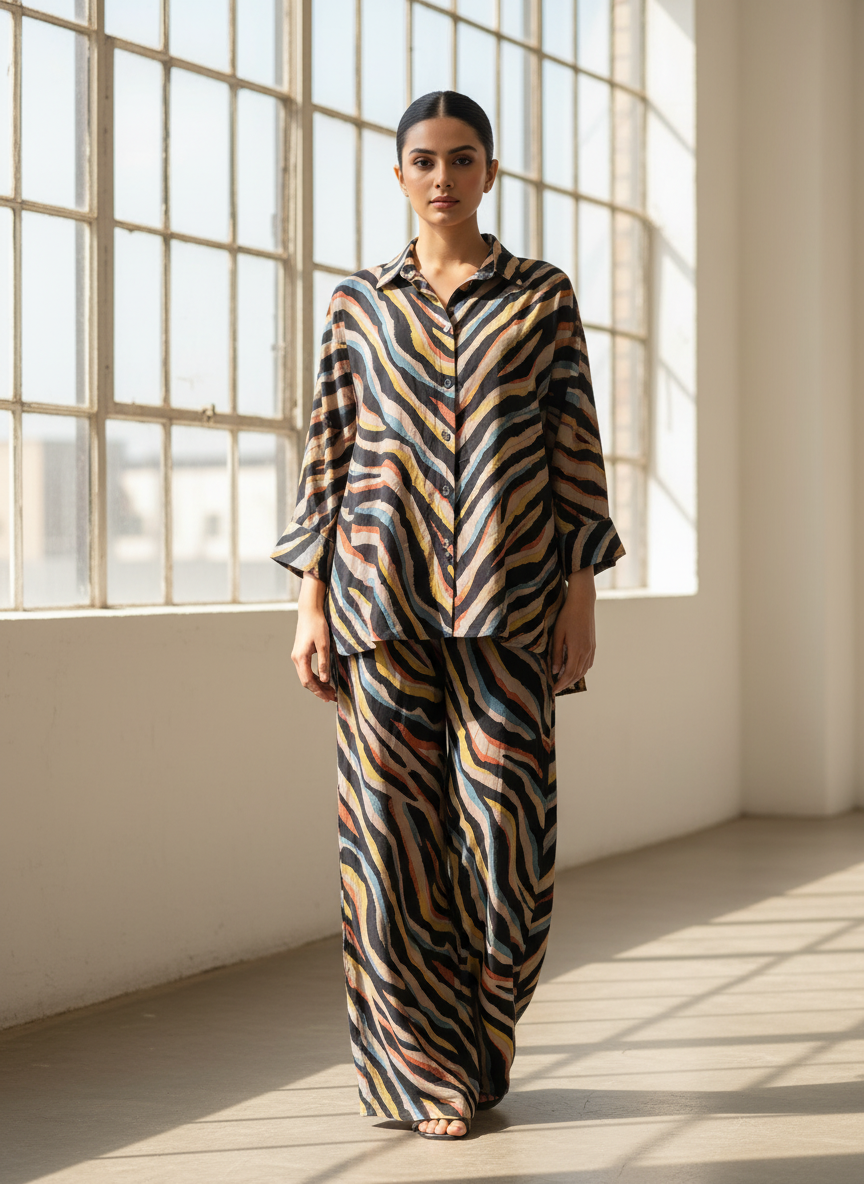 + ShippingUnwind in style with our Wild Mirage Coord Set, designed for effortless sophistication. Crafted from lightweight, breathable fabric, this set features a relaxed-fit button-down shirt paired with wide-leg trousers, offering comfort without compromising on elegance.